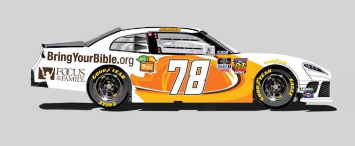 First, I’m delighted to announce that NASCAR’s veteran race car driver J.J. Yeley will be competing in the next two Xfinity Series races (Friday, September 20 in Richmond, VA and Saturday, September 28 in Charlotte, NC) by driving his No. 78 Toyota Supra wrapped in the ‘Bring Your Bible to School Day’ logo and colors.